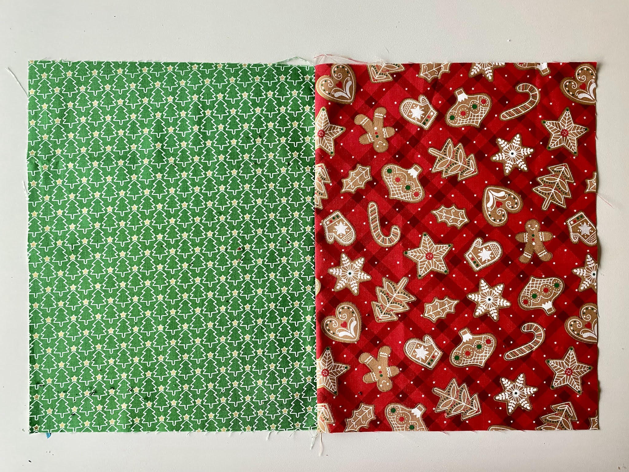 Take one of your Mini Tree pieces and one Gingerbread Treats piece and place right sides together. Sew along the longer 12” side. Press the pocket piece open. Repeat for the two remaining pieces. This is now the “patchwork” pocket piece.